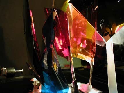 For The Meaning of Life's difficult sunset scene, a complicated network of moving colors on sticks are used to subtly change the lighting throughout the entire sequence. At right is a page of notes for slowly maneuvering each color as the scene plays out beneath the camera. |  |